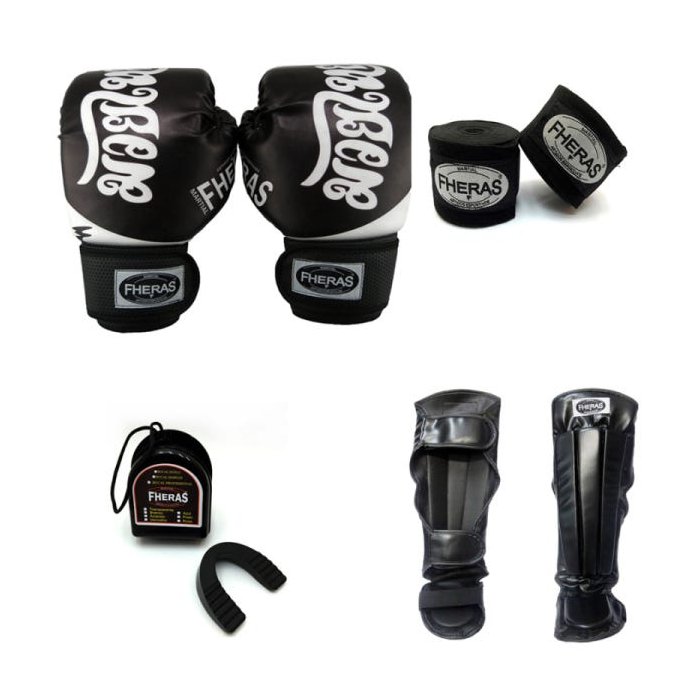 Kit Muay Thai Top - Luva Caneleira Bandagem Bucal - 12 Oz Tailandês Preto
