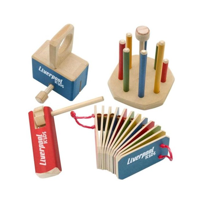 Esse kit acompanha instrumentos ao qual irão auxiliar no ensino musical e criatividade musical nas crianças. Cada instrumento foi cuidadosamente escolhido justamente para ensinar a criança os sons e os ritmos dos instrumentos, deixando criar a sua criatividade musical. Acompanha Bag / Bolsa em plástico transparente. Kit c/ 04 instrumentos, sendo: 01 Xilindró + batedor/baqueta ambos fabricados em madeira mdf bem leve e resistente (peso total aprox. 170g); 01 Matraca fabricada em madeira mdf (peso total aprox. 45g); 01 Linguarudo com 12 placas fabricado totalmente em madeira (peso total aprox. 145g); fabricado em madeira (peso total aprox.120g).Material:Madeira mdfAcessórios:Bag em plástico transparentePesquisa:instrumentos|percussão|liverpool|infantil|kit|5519|
