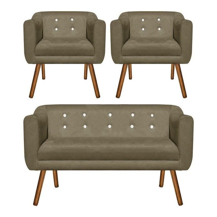 Kit Namoradeira 2 Lugares e 02 Poltronas Julia Suede Marrom Rato com Strass O Kit namoradeira e poltrona julia possuem um design retrô que forma uma composição perfeita para qualquer ambiente, e está aberto para compor todos os estilos decorativos. Todas suas peças são naturalmente alinhadas, mas também se completam entre si. Os pés palito de madeira, suas curvas suaves e os botões de strass dão todo um charme. Com conforto e elegância na medida certa proporcionado pela estrutura de madeira de eucalipto proveniente de reflorestamento, espuma com densidade D-26 (encosto e no assento) e D-20 (braças), revestimento de tecido suede acetinado animale (100% Poliéster), um amor! Para sua sala, recepção ou clinica. Dê de presente uma dessas para o seu ambiente! A cor do produto pode sofrer variações, devido ao lote do tecido e/ou a resolução do monitor e/ou iluminação do ambiente. Especificações do Produto: - Design exclusivo; - Possui características, dimensões, acabamento e qualidade de alto padrão; - Fabricado em madeira de eucalipto e MDF; - Tecido suede acetinado animale; - Espuma D-26 | D-20; - Chapas de ferro; - Pés palito de madeira na cor castanho; - Persintas elásticas; - Peso: Namoradeira: 21 Kg | Poltrona: 15 Kg. Dimensões: Namoradeira Júlia: - Altura: 76 cm - Largura: 1,20 m - Profundidade: 56 cm Medidas Internas: - Profundidade do Assento: 45 cm - Largura Livre do Assento: 100 cm - Altura do Encosto: 32 cm - Altura dos pés até o Assento: 50 cm - Altura dos pés até a Braça: 68 cm Poltrona Júlia: - Altura: 76 cm - Largura: 70 cm - Profundidade: 56 cm Medidas Internas: - Profundidade do Assento: 45 cm - Largura Livre do Assento: 50 cm - Altura do Encosto: 32 cm - Altura dos pés até o Assento: 50 cm - Altura dos pés até a Braça: 68 cm Você irá receber: 2 volumes com 3 produtos. Peso Suportado: Namoradeira: Até 220 Kg | Poltrona: Até 120 Kg Montagem: O produto vai montado, apenas rosquear os pés na base. Garantia: 90 dias. Instruções de Limpeza: Utilizar um pano limpo e seco. Não limpar com escovas ou produtos abrasivos. Obs: Este produto é recomendado para ambientes residenciais em áreas internas, por isso, não o deixe exposto à luz direta do sol, para que não sofra alteração na cor. Observações Relevantes: - As imagens são meramente ilustrativas, não acompanham objetos de decoração e eletros; - As cores dos produtos podem sofrer alterações dependendo do seu monitor; - Todos os produtos vão embalados com total segurança; - Ao receber o produto o cliente deve verificar as condições da embalagem, havendo alguma avaria não assine o comprovante de recebimento, entre em contato com a loja para orientações; - Alguns produtos como a linha de estofados, puffs e poltronas, são produzidos sob encomenda, portanto o prazo de entrega pode ser maior; - Ofertas e condições válidas somente para compras via internet; - Todos os produtos estão sujeitos à alteração de preço sem prévio aviso (produtos em pedidos realizados não tem seu preço alterado) e sujeitos a disponibilidade de estoque dos distribuidores e fabricantes; - Não nos responsabilizamos no ato da entrega por montagens, desmontagens, instalações de produtos, nem utilização de guinchos ou equipamentos similares para acesso a pisos superiores em apartamentos. - Confira as dimensões do produto no momento da compra e certifique-se de que passará normalmente por escadas, elevadores, portas e corredores. Observando as orientações acima, evita-se futuros desagrados ou imprevistos com a entrega do produto. Havendo despesas adicionais, serão de responsabilidade do cliente.