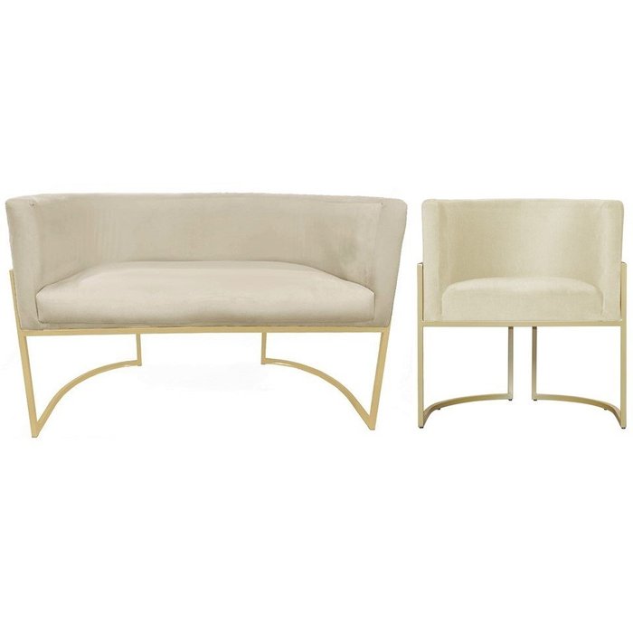 Kit Namoradeira + 1 Poltrona Decorativa Luana Suede Marfim Base Dourada Ms Decor Marfim