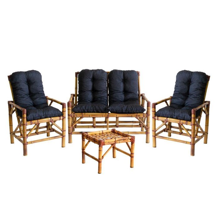 Conjunto Artesanal de Bambu tratado de reflorestamento e envernizado; reforçado e resistente.Além de lindo fica perfeito em qualquer ambiente. Ótimo para Decoração de sua varanda, sítio, sacadas, área, churrasqueira, edícula e sala, Cozinha, Quarto, Jardim, Área de lazer, Festa, Reunião,Área de Churrasco.Produto composto: 1 Namoradeira (2 lugares) + 2 cadeiras individuais + mesa de centro + 4 almofadas (várias estampas).- Suporta 150Kg. Aprox.;