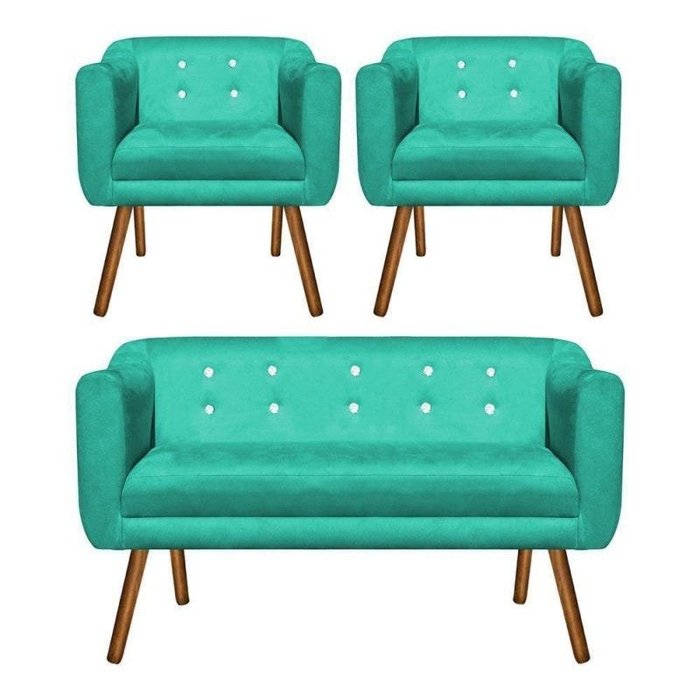 Kit Namoradeira 2 Lugares e 2 Poltronas Julia Suede Verde Tiffany com Strass - D'Rossi
