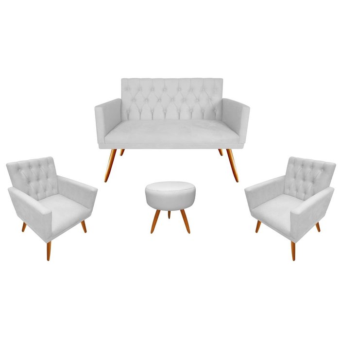 Kit Namoradeira + 2 Poltronas Decorativa Nina Capitonê + Puff Redondo Couro Branco Pés Madeira Mz De