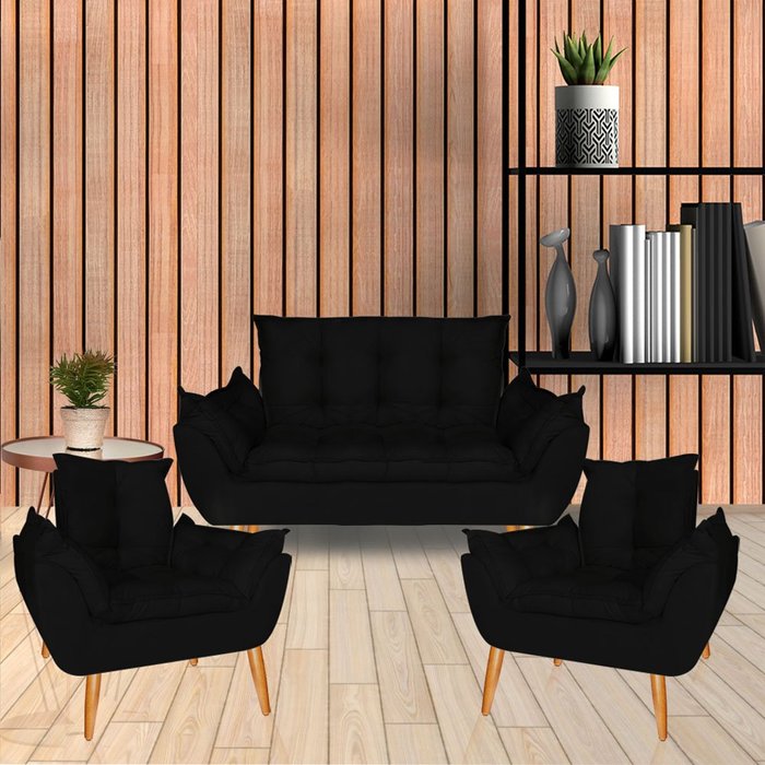 Kit Namoradeira + 2 Poltronas Decorativas Opala Preto