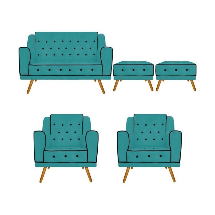 Kit Namoradeira, 2 Poltronas e 2 Puff Olivia Pés Palito Mel Suede Azul Turquesa - Doce Sonho Mó