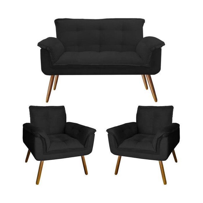 Kit Namoradeira + 2 Poltronas Opala Decorativa Suede Preto