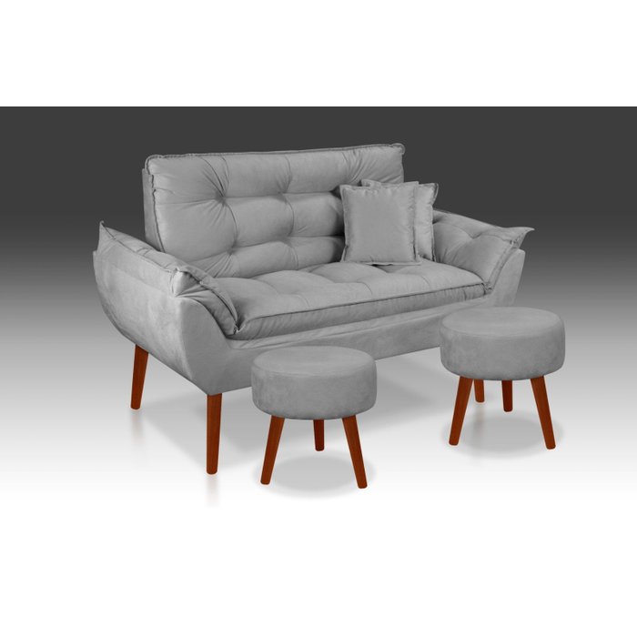 Kit Namoradeira+ 2 Puff Redondo+ 2 Almofadas Suede Cinza Claro-Rv Decora Cinza Claro