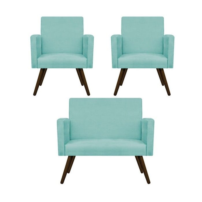 Kit Namoradeira e 02 Poltronas Beatriz Palito Tabaco Suede Azul Tiffany - Doce Sonho Móveis