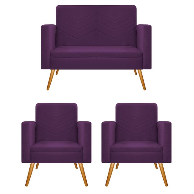 Kit Namoradeira e 02 Poltronas Bella Pés Palito Mel Suede Roxo - Doce Sonho Móveis Roxo