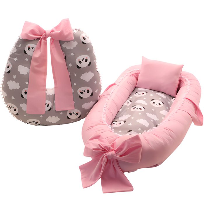 Kit Ninho para Bebê Redutor de Berço + Almofada Amamentação Pompom Panda Rosa