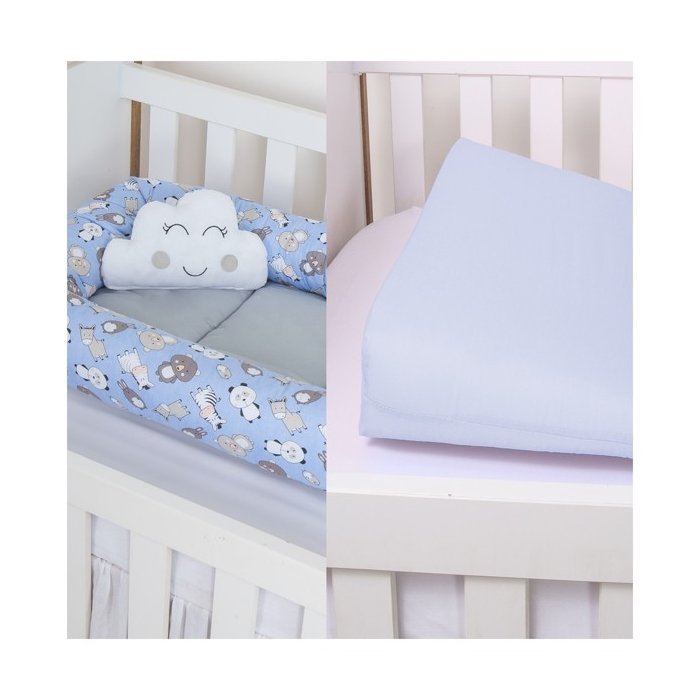 Kit Ninho Redutor de Berço 2 peças Bichinhos Azul e Cinza + Travesseiro Anti-Reluxo P
