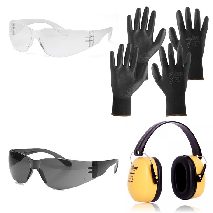 Kit Oculos Proteção Incolor Escuro Luvas Abafador Ruido Epi