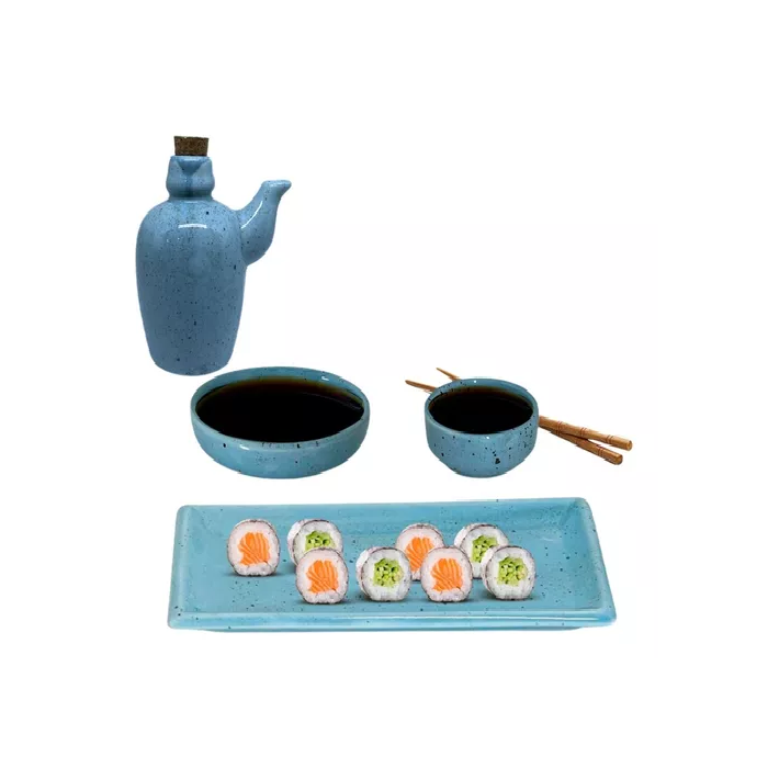 Kit Oriental 6 Pessoas Prato Molheira Jarra Porcelana Azul Prattos