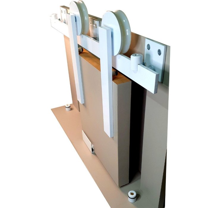 As chapas das roldanas não possuem capa, o acabamento é feito na própria chapa de alumínio maciça seguindo a tendência de produção do trilho, pelo qual não aparece furos ou parafusos, permitindo um acabamento com maior elegância.