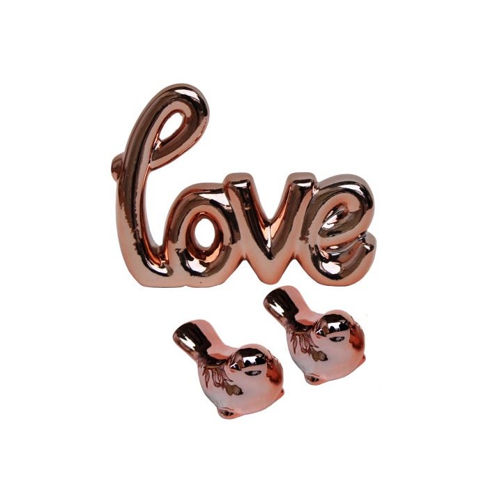 Estatua Palavra Decorativa Love em Cerâmica na cor Rose + casal de passarinhos Rose