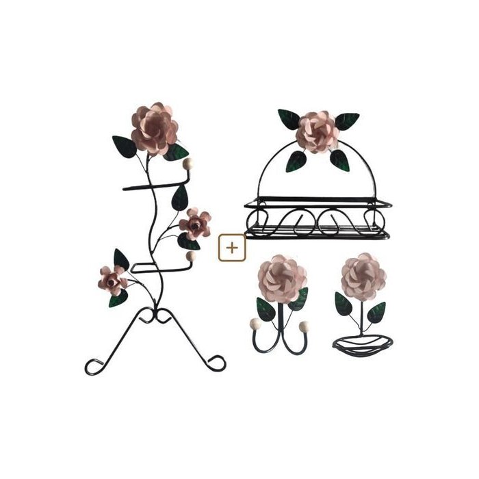 **KIT PARA BANHEIRO 4 PEÇAS EM FERRO COM ROSAS**