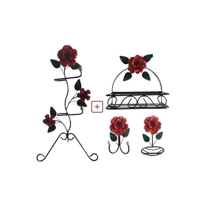 Kit para Banheiro 4 Peças em Ferro com Rosas:vermelho