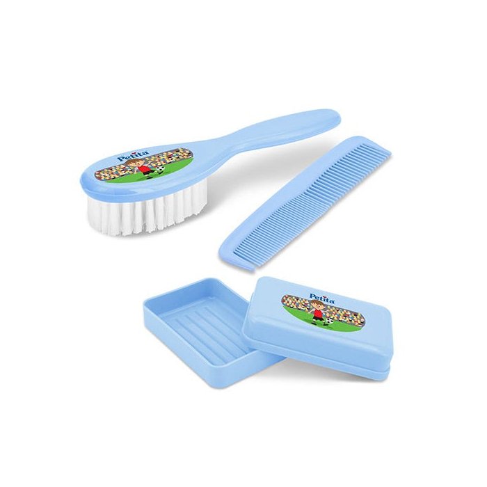 O Kit para Banho da PETITA é composto por 01 pente, 01 escova e 01 saboneteira, feitos em polipropileno totalmente atóxico, livre de Bisfenol-A (BPA) e Ftalatos.
