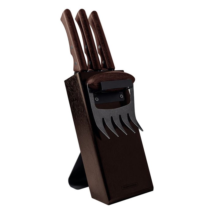 DESCRIÇÃO:Para preparar, cortar e servir aquela carne assada deliciosa, o kit para churrasco Tramontina Churrasco Black com lâminas de aço inox escurecido e cabos de madeira 05 peças é ideal. Composto por três facas de funções variadas e uma garra multiuso, garante maior praticidade e versatilidade para seu dia a dia. Suas peças são desenvolvidas com lâminas em aço inox escurecido e contam com cabos de madeira, rebites de aço inox escurecido e design anatômico, que tornam o uso muito mais firme e confortável. As facas são resistentes, duráveis e vêm com suporte de madeira que garante maior organização e funcionalidade na hora de guardá-las.DADOS TÉCNICOS:Lâminas: Aço inox escurecidoCabos: Madeira com design anatômicoRebites: Aço inox escurecidoPeças: 5 (três facas, uma garra multiuso, suporte de madeira)Resistência e durabilidade: SimSuporte para facas: MadeiraConforto e firmeza no uso: SimITENS INCLUSOS: 3 Facas1 Garra1 Suporte