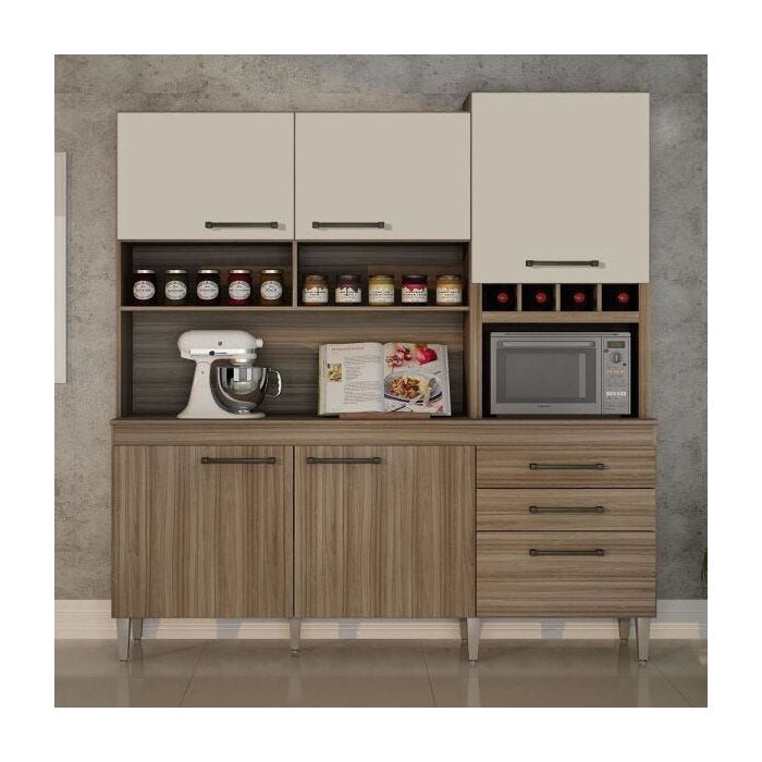 Esse modelo é composto por armários e gavetas que oferecem espaço suficiente para armazenar utensílios de cozinha e eletrodomésticos.