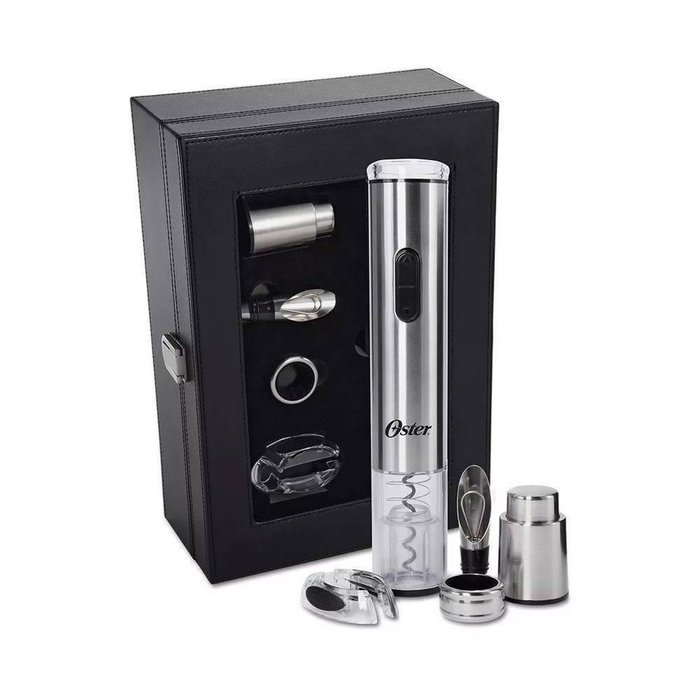 Gosta de apreciar um bom vinho ou conhece alguém que goste? O kit Oster é perfeito para quem ama vinho. Possui acessórios que facilitam e auxiliam na hora da degustação. Com acabamento em aço inox escovado, que traz muito mais charme e beleza para o kit. Muito mais facilidade na hora de abrir aquele vinho, o cortador de lacres é prático, junto ao elegante abridor elétrico, que em um simples toque de botão remove a rolha sem quebrar, sem nenhum esforço. Ta afim de tomar só um taça...não tem problema, pois o kit possui um bomba a vácuo que elimina o ar da garrafa e faz a vedação da mesma, mantendo as propriedades do vinho. O kit Oster tem tudo o que você precisa para deliciar-se com seu vinho preferido e relaxar.