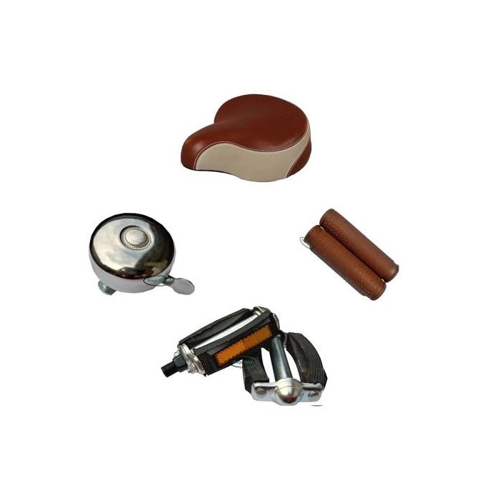 O Kit de de Acessórios Retrô permite ao Ciclista trazer a tona o sentimento de classe. Os acessórios são de enorme beleza e trazem para a sua bicicleta um aspecto diferenciado. A cesta tem um grande charme, as manoplas em conjunto com a campainha e os pedais, dão um enfoque ao charme do conjunto