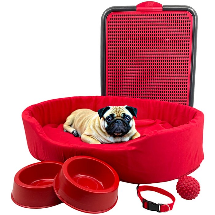Kit Pet Médio Cama Europa Sanitário Comedouro Coleira Bola - Vermelho Vermelho