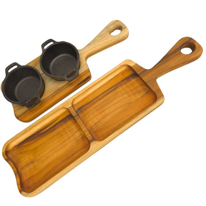 O Kit Petisqueira de Madeira é composto por uma petisqueira de madeira Teca de reflorestamento, medindo 43 cm x 12 cm, com duas divisões, e um suporte de madeira Teca de 30 cm x 12 cm, ambos com certificação FSC. Acompanhando o kit, duas panelinhas de ferro fundido com 4 cm de altura, 7 cm de largura e capacidade de 110 ml, perfeitas para servir molhos, porções ou acompanhamentos. Todos os itens são produzidos com os melhores equipamentos, garantindo qualidade, durabilidade e um acabamento de alto padrão.