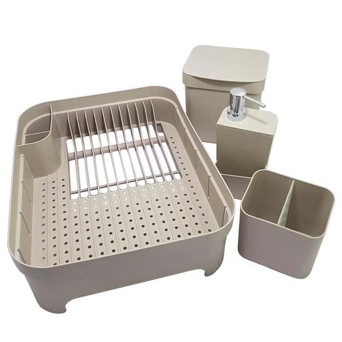 Este kit é essencial para a sua cozinha. O escorredor de pratos e de talheres, porta detergente e lixeira são indispensáveis no nosso dia a dia. Possuem material resistente e que não transfere odor, os organizadores de louças, permitem separar e organizar os talheres, pratos, copos e outros utensílios em cima da bancada, com base vazada para o escoamento da água. O dispenser para detergente comporta o produto de limpeza e esponja, deixando a pia organizada. E a lixeira por ser compacta proporciona praticidade.