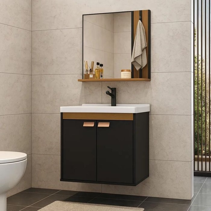 Kit Pia Gabinete Cuba Espelheira Armário Banheiro Lavabo Preto/nature