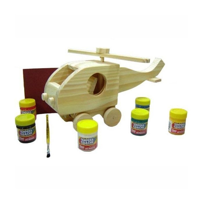 Composto por 1 helicóptero grande de madeira PINUS, 1 pincel, 1 lixa, 6 tintas guaches não-tóxicas.
