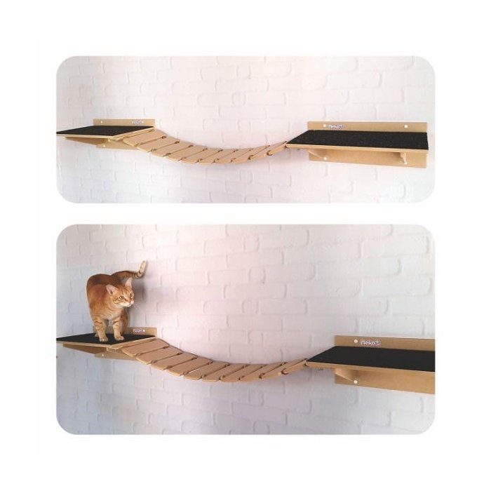 A ponte tem 22 cm de largura por 1,05 m de comprimento, é fabricada em Mdf Cru de 12mm e seus espaçadores (bolinhas que deixam a ponte flexível) é de madeira natural. A Ponte é montada em uma corda de nylon de alta resistência pra garantir a segurança dos seus gatos.