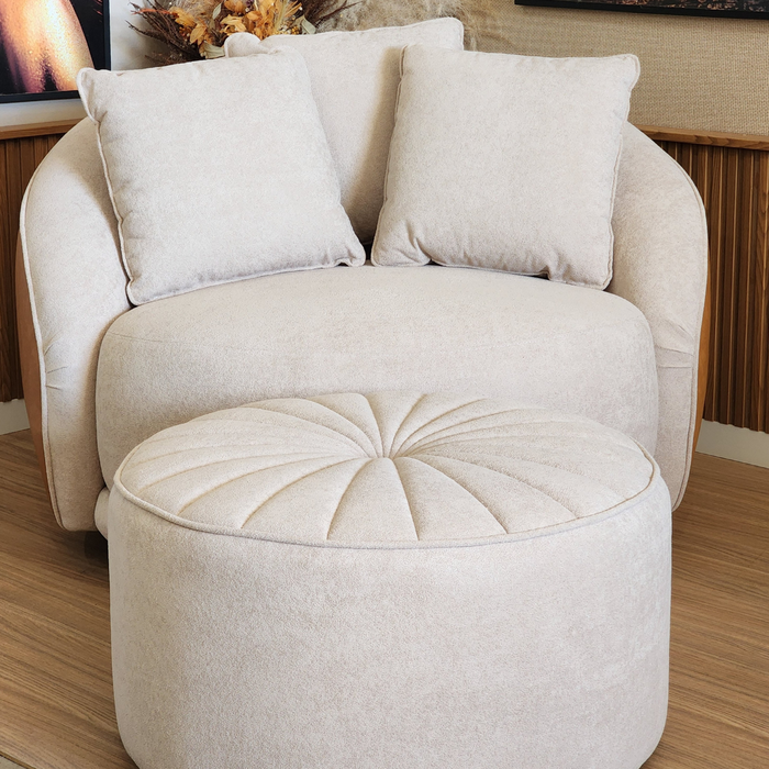 Kit Poltrona Ayla Giratória com Puff, Organico, Redondo, Almofadas, Linho Bege e Sintético
