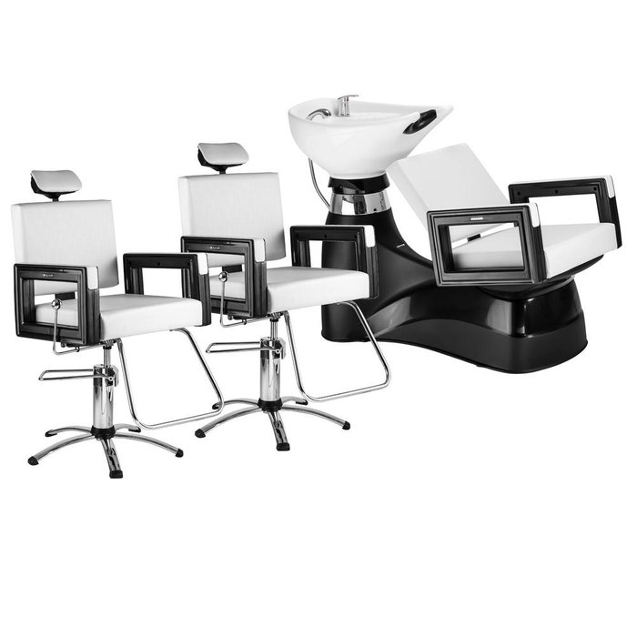 O conjunto Square da marca Dompel é acompanhado de duas cadeiras hidráulicas, regulagem de altura com pedal, e encosto reclinável. Também com um lindo lavatório em cuba de porcelana, o qual acompanha conjunto hidráulico (mangueiras em aço, torneira monocomando, ducha e suporte para aquecedor). Conjunto ideal para corte de cabelo, maquiagem, sobrancelha, barbearia, e demais atividades do salão de beleza. A cadeira companha apoio de cabeça removível e com regulagem de altura. Especificações Cadeira: - Sistema de regulagem de altura hidráulico; - Sistema de reclíneo (pneumático); - Estrutura de alta resistência; - Braços em polipropileno injetado, laváveis, impermeáveis e resistentes à produtos químicos; - Acompanha apoio de cabeça anatômico, removível e com regulagem de altura; - Apoio de pés em aço cromado; - Base pentapé cromada; - Suporta até 150 kg; - Assento amplo com espuma de alta densidade (confortável, durável e resistente); - Estofado sofisticado, com design em linhas retas e precisas. Medidas Cadeira: - Largura: 68cm - Profundidade: 87cm - Altura: mínima de 97cm / máxima de 109cm Especificações Lavatório: - Acompanha torneira monocomando; - Cuba reclinável; - Mangueiras de aço cromado flexíveis; - Acompanha protetor de pescoço; - Estrutura de alta resistência; - Braços em polipropileno injetado, laváveis, impermeáveis e resistentes a produtos químicos; - Assento amplo com espuma de alta densidade (confortável, durável e resistente); - Estofado sofisticado, com design em linhas retas e precisas; - Suporta até 150 kg Medidas Lavatório: - Altura: 96,80cm - Largura: 62,5cm - Comprimento: 127cm