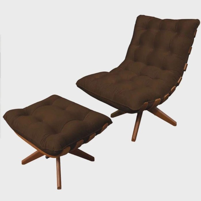 Kit Poltrona Com Puff Costela Base Em Madeira Giratória Marrom