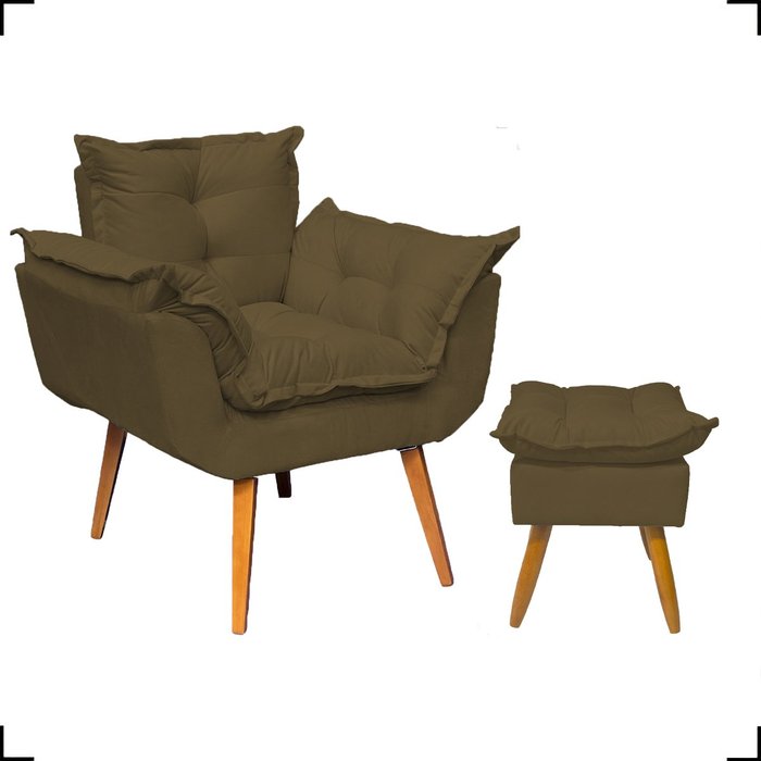 Atualmente usamos madeira de Eucalipto para estruturas de madeira, percintas elásticas em Nylon, também usamos fibra siliconada que as tornam macias e com bom tempo de durabilidade, grampos galvanizados, e para acabamento usamos tecido suede que é conhecido por sua beleza e resistência, e como toque final, a poltrona com pés trapézio de madeira e o puff com os pés palitos na cor castanho claro.