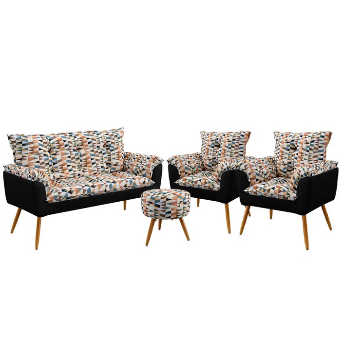 Kit Poltrona Namoradeira e 2 Poltronas Beta com Puff Solar Suede Estampado Laranja com Preto Aradeco