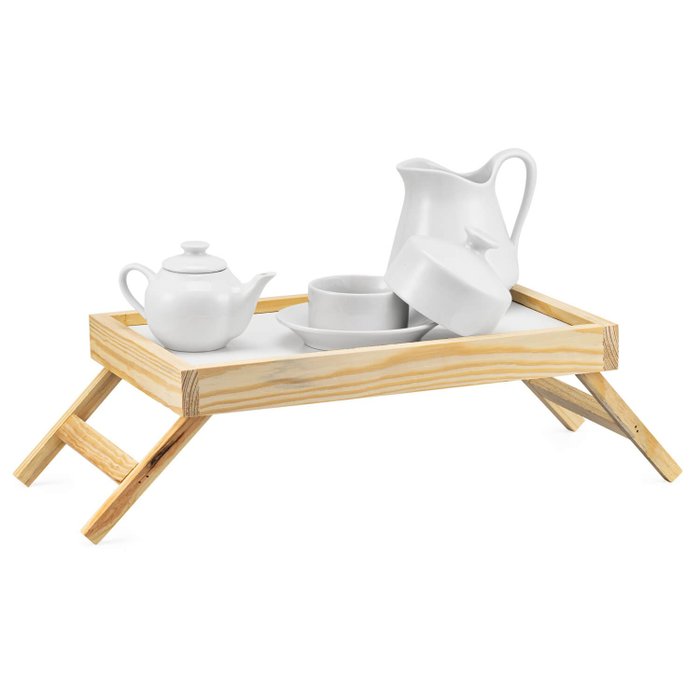 Kit de louça para mesa de café da manhã contendo quatro itens: uma bandeja de madeira com pés, uma jarra média, um mini bule e uma manteigueira com tampa.