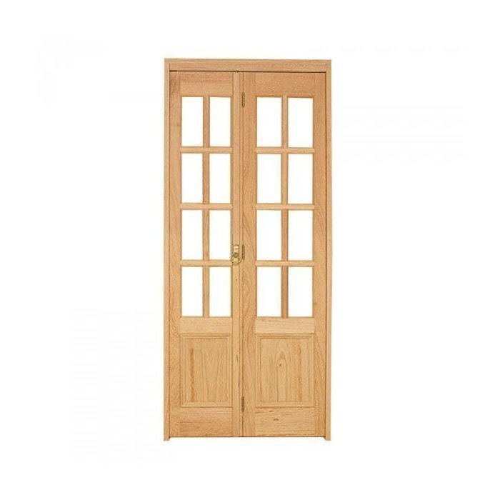 A porta constitui de duas folha estilo pantográficas (cotovelo) e batente de 3,1 cm de grossura, possui 4 dobradiças estilo camarão, uma cremona de embutir no acabamento em ouro velho, trilho de alumínio e um puxador de 19 cm. O número de vidro varia com o modelo escolhido pelo cliente. Acompanha guarnição (vistas) 6 cm para um lado. O tom da madeira pode variar, por se tratar de um produto natural.