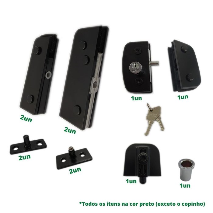 Kit porta dupla pivotante de vidro temperado `blindex`, sistema invertido. Ferragem ideal recomendada para vidro temperado com espessura de 6 a 10 milímetros. TODOS OS DETALHES TÉCNICOS DOS PRODUTOS ESTÃO DESCRITOS NAS IMAGENS DESTE ANÚNCIO. Ficha Técnica: -Linha: Ferragens para recorte com padrão Santa Marina -Modelo: Fechamento vidro/vidro -Cor: Preto -Material: Alumínio -Aplicação: Porta dupla de giro/pivotante em vidro temperado blindex Contém: -1un Fechadura com duas chaves (1520) -1un Contra fechadura alvenaria (1504 A) -2un Dobradiça inferior (1103 S) -2un Pivô inferior (1013 S) -2un Dobradiça superior (1101 S) -2un Pivô superior (1201 S) -1un trinco (1335) -1un contra trinco modelo copinho (1038)