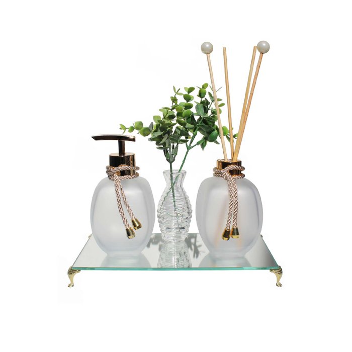 Kit Porta Sabonete e Difusor Vidro Jateado com 300ML + Bandeja com pés Dourados + Mini Vaso de Vidro