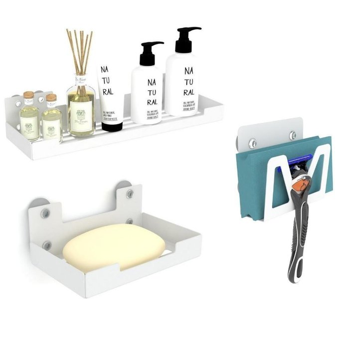 Kit Porta Shampoo Saboneteira E Suporte Barbear Branco Elg