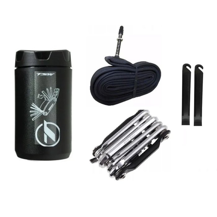 Kit composto por: 1 Porta treco objetos, 1 Câmara aro 700 x 18/23cc, 1 chave ferramentas 12 funções, 2 espátulas para retirar Pneu de bicicleta