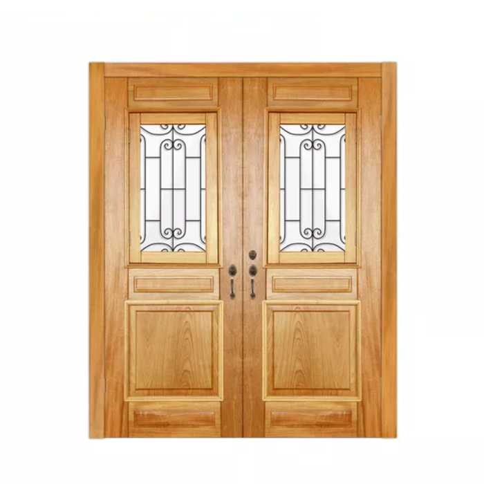 Kit composto por duas folhas de porta Alteza com grade (porta acompanha postigo) montadas no batente de 14cm em madeira maciça tauari.