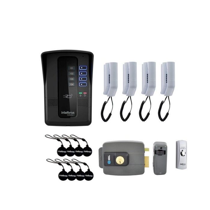 Perfeito para condomínios de pequeno e médio porte, o Kit Porteiro Coletivo de 4 Pontos reune um sistema de central de portaria, com porteiro eletrônico, ramais internos, controles de acesso via cartão de proximidade e fechadura elétrica.