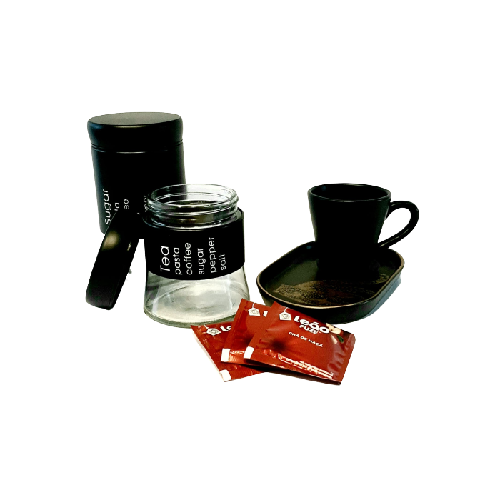 Kit 2 Potes Chá e Açúcar em Vidro com acabamento estilo industrial. Leve GRÁTIS xícara preta com pires em borda dourada.