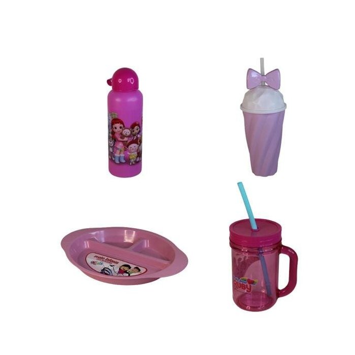 Kit Pratinho + 3 Garrafinhas Suco Água Leite Infantil Rosa