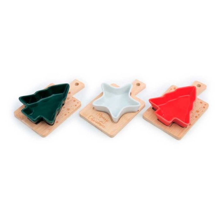 Kit Prato, Arvore e Estrela em Ceramica c/Base Madeira Natal