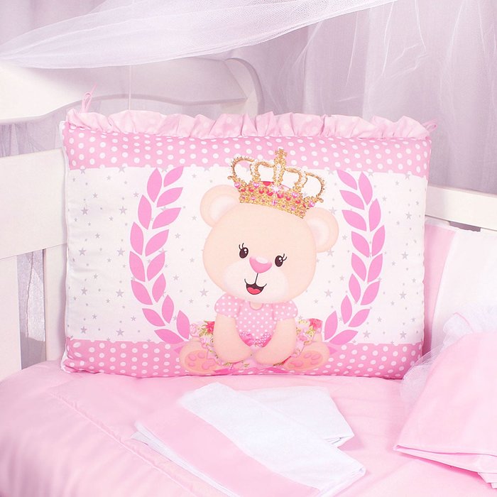 Kit Protetor Berço Americano Menina Rosa Ursa Realeza 9 Peças Americano / Nacional