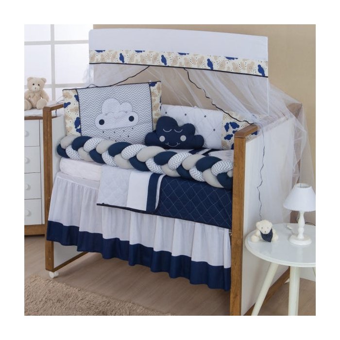 Kit Protetor de Berço Menino Nuvem Trança 09 Peças - Serve em Berço Americano e Nacional Atenção!! Não acompanha a saia. Pronto para deixar seu príncipe mais seguro e confortável, o Kit Berço Nuvem Trança deixa o quarto da seu pequeno mais alegre e cheio de amor. Nessa criação exclusiva, a decoração do quarto de bebê ganha estampas e bordados originais. Com 10 peças, indicadas para berço nacional ou americano, esse enxoval de bebê proporciona bem-estar e aconchego para o neném. Os enchimentos são de fibra de poliéster siliconada e deixam os produtos bem fofinhos! O edredom Dupla Face Matelado aquece nos dias mais frios do ano, enquanto o jogo de lençol, com fronha, lençol de baixo com elástico e lençol de cima evita o contato entre o neném e a superfície do colchão. Preocupado com a segurança do seu amor, os protetores (cabeceira e laterais) evitam o contato do bebê com a estrutura do móvel, dessa maneira eles não prendem os bracinhos e as perninhas nas grades. O kit inclui mosquiteiro com bandô o que mantém os insetos afastados do pequeno, garantindo uma noite tranquila. Conteúdo do kit: 01 - Cabeceira 37cm x 62cm 01 - Lateral 1.25m x 30cm 01 - Trança 1.25m x 20cm 01 - Lençol de Cima 1,25m x 80cm 01 - Edredom 1,25m x 80cm x 14cm 01 - Fronha 28cm x 38cm 01 - Bandô de Mosquiteiro 1,40m x 22cm 01 - Mosquiteiro 4,60m x 1,50m 01 - Almofada de Nuvem 0,40cm x 0,20cm 01 - Almofada de Gota Obs: Edredon dupla face todo matelado com várias costuras . Laterais e cabeceiras com zíper para facilitar a lavagem de seu produto . COMPOSIÇÃO : Tecido estampado : 100% Algodão Tecido colorido : 100% Poliester Tecido lençol : 50% Algodão 50% Poliéster Tule : 100% Poliamida Plástico : 100% Pvc Enchimento : 100% Poliester